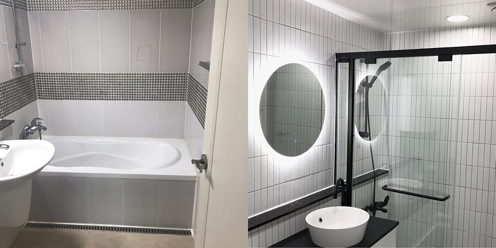 화장실입니다. 욕조 철거 후 샤워부스 설치. 타일, 욕실가구, 샤워기, 변기, 세면대 모든 자재 직접 구입 후 타일 전문가만 섭외해 공사. 욕실가구와 세면대는 이케아에서 구입 후 설치. 샤워부스는 업체 섭외 후 공사를 진행하였습니다.