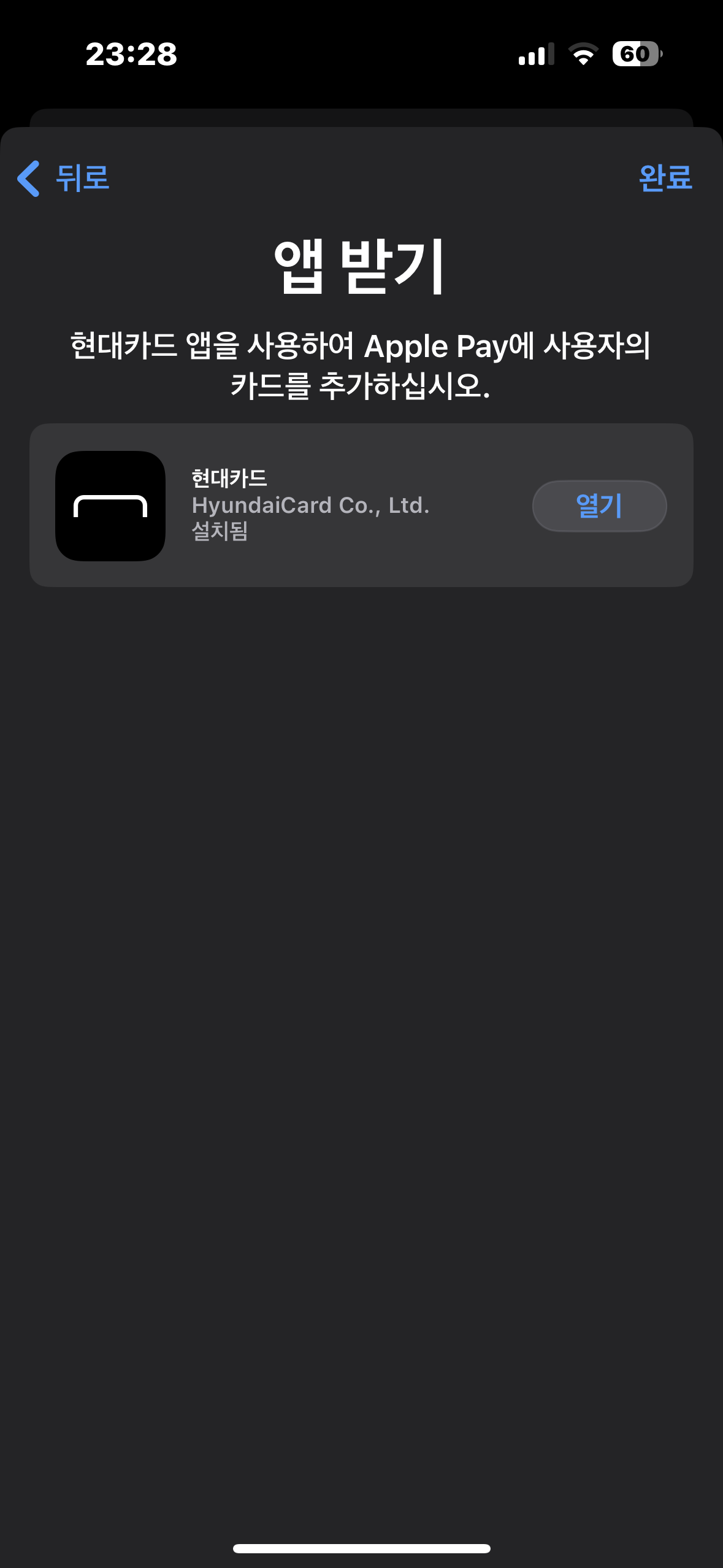 카드를 추가할수 있으나 국내에선 현대카드만 가능하여 바로 현대카드앱으로 이동을 하게 됩니다.